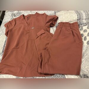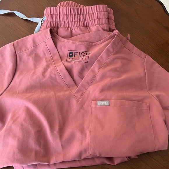 Catarina one pocket top size small, zamora joggers size small (the pants were a regular small but were hemmed to petite) in mauve. Only worn a few times. Selling because I am no longer in vet med.