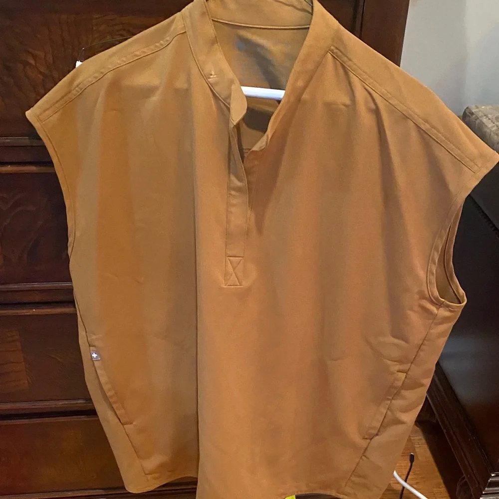 Upgrade your wardrobe with this stylish tan sleeveless shirt. Perfect for casual outings or layering, this shirt offers comfort and versatility.