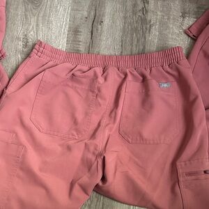 Stylish rose scrub set with V-neck top and drawstring pants. Perfect for healthcare settings.