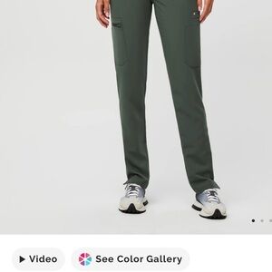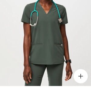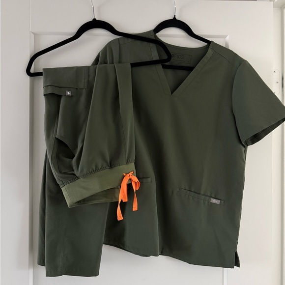 Figs scrub set - top and pants. Top has 2 pockets on bottom, bottoms are straight leg style with two back pockets, front pockets, 1 zip pocket on leg and 2 stash pockets on other leg.