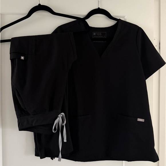 Figs scrub set - top and pants. Top has 2 pockets on bottom, bottoms are straight leg style with two back pockets, front pockets, 1 zip pocket on leg and 2 stash pockets on other leg.