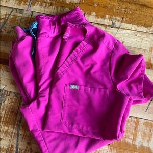 Comfortable and stylish Figs scrub set. Lavender color. Bottoms are jogger style, medium petite. Top is oversized style, medium. Nonsmoking home. Top has tiny faded bleach mark near front/center. It’s honestly hard to see, and this hard to capture in a photograph. But want to be upfront! No other flaws. Perfect for healthcare professionals.