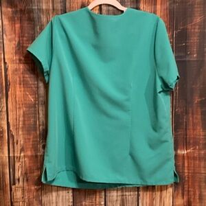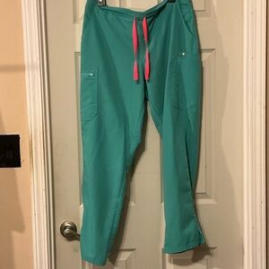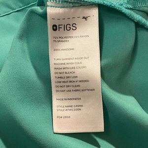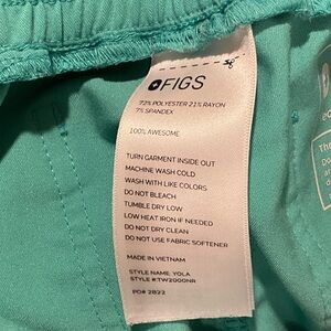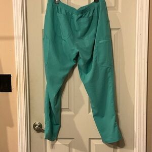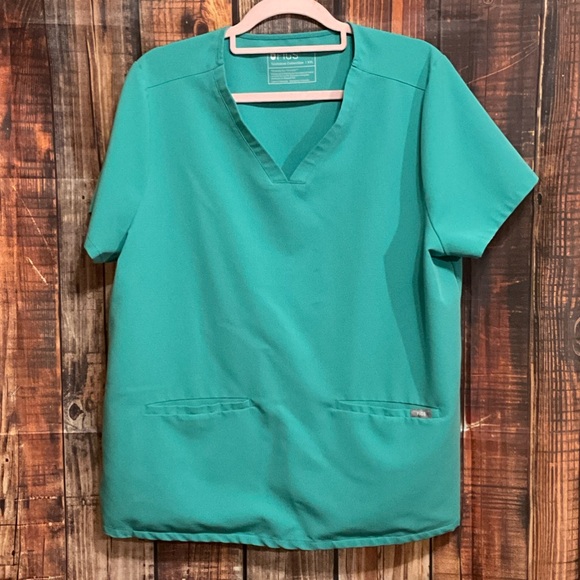 Figs scrub set. Worn a couple of times. If you’ve never worn figs, sizing is off from traditional scrubs. I size up. I am 5’4” 38DDD 12/14 pants L/XL tops. Lots of wear left.