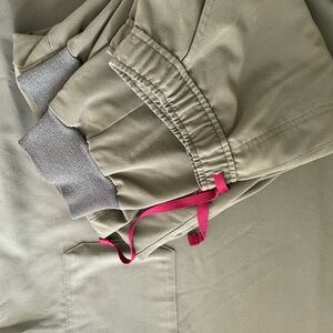 Stylish olive green scrub top and jogger style pants both size large by Figs. Perfect for healthcare settings.