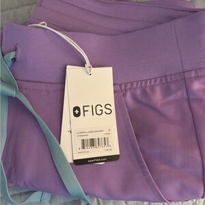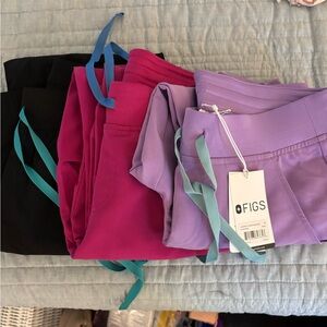 Figs scrub pants in sleek black. Ideal for healthcare professionals. Pink XS (fits like S). Purple and Black are S. Pink and purple are joggers. Black is straight. Never worn.