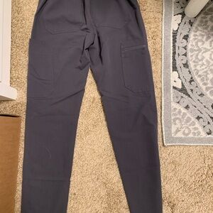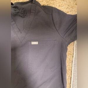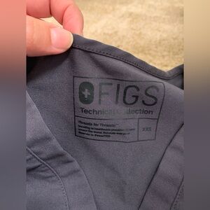 Comfortable gray scrub top by Figs. Size XXS. Features a V-neck and chest pocket. Comes with matching scrub pants as well. Pants are straight leg fit - not quite joggers. Parting ways as these are too small for me now and not the color I need for my future job.