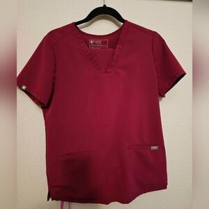 Maroon scrub top and jogger set by Figs. Top is Short sleeves with V-neck style and pants in jogger. Both Small size, dark pink tone in color.
