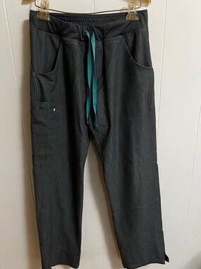 FIGS technical collection scrub set in graphite pants and top are size small. Pants have a turquoise drawstring. Never worn…bought accidentally.
