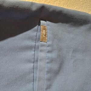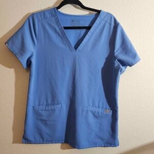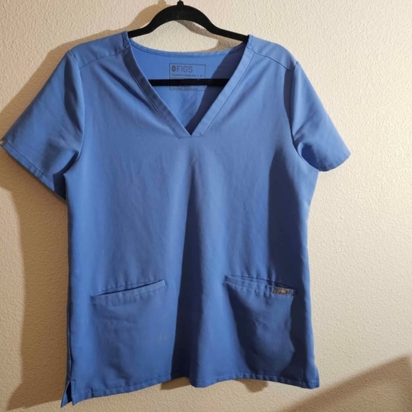 Stylish blue scrub top by Figs. Features a V-neck and two pockets. Good used condition.