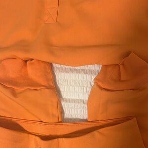 Bold orange scrub top and pants. Perfect blend of comfort and style.
