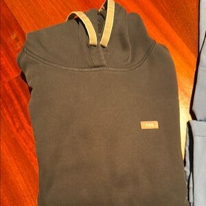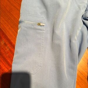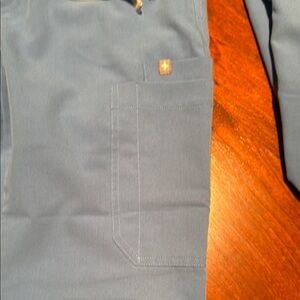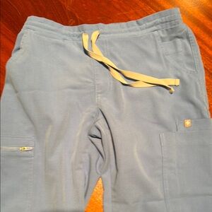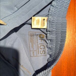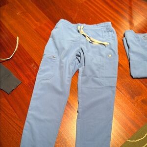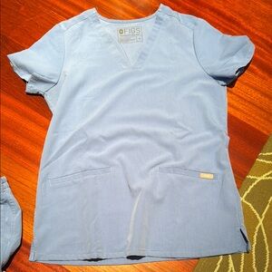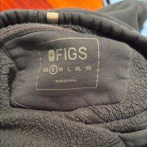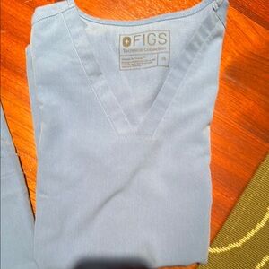 Figs bundle, you get one set of scrubs and one hoodie sweatshirt from figs all are in the size extra small, and the hoodie is a navy color while the scrubs are a light blue
