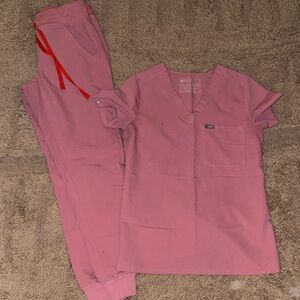 Figs scrub set. Top XXS one pocket, Bottoms XS high waisted yola. Color is a lavender purple with blue draw strings. Set has ink stains.