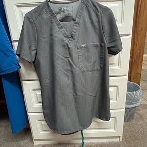 Stylish gray scrub top by Figs. Features a V-neck and chest pocket.