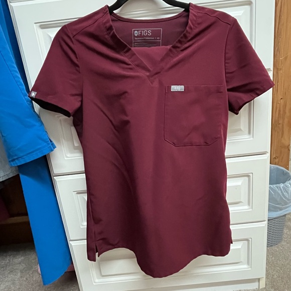Stylish burgundy scrub top by Figs. Features a V-neck and chest pocket.