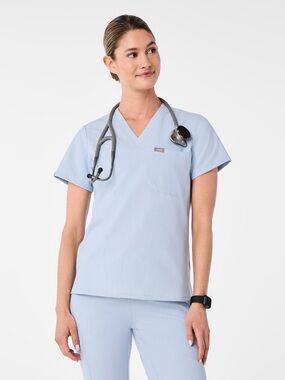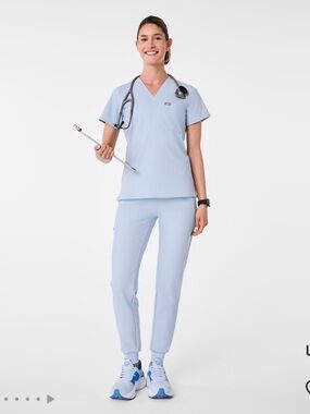 Small Catarina top and small petite Zamora joggers in Chambray color (very pretty light blue!)