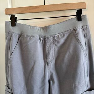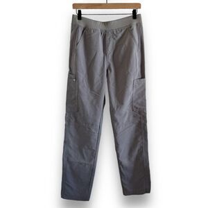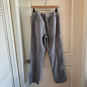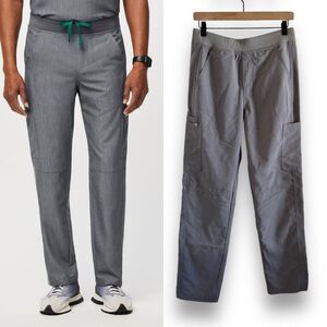 Figs Axim Cargo Scrub Pants size small. Scrub pants with cargo pockets on side and stretchy waistband with hidden drawstring. Color is slightly different than what is shown in the stock photo. They are a light grey color with a very subtle stripe to it. There is a small mark on the front of the waistband (see last photo) other than this in great condition.