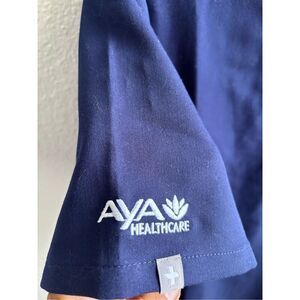 NWOT Figs Technical Collection Navy Blue Scrub Top wit Aya Embroidered on Sleeve Size Med