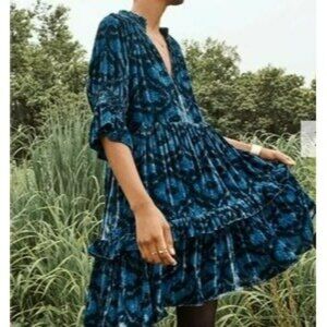 NEW Figue Halima Dress Blue Tiger Velvet Tiered Ruffle Mini Dress XS