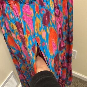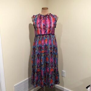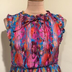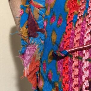 Please note the tassels were cut off but otherwise the dress is in excellent condition. The edges are intentionally raw. Sleeveless, hook closure neckline that looks good partially unfastened or fastened all the way up, fit and flare silhouette midi dress with pockets. The waistband is stretchy. Blue, pink, purple, yellow and orange print.