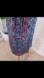 it has a beautiful print in purple and blue hues. A strappy X cross, U-shaped back with thin blue straps and dangling tassels.