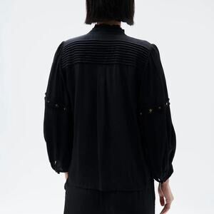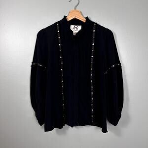 Figue "Emilia" twill top featuring mirrors and seed bead hand-embellished raw-edge grosgrain trim and a pleated bib front Ruffle crew neckline; concealed button front 3/4 puff sleeves; button cuffs. 100% viscose. MSRP $398.