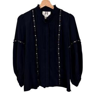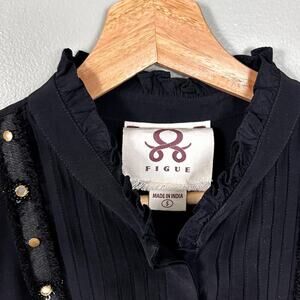 Figue Emilia Top Black Boho Beaded Pleated Ruffle Bib Embellished Blouse Small