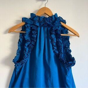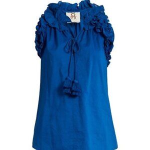 Racerback design inspired. Slightly A-line silhouette. Sleeveless, wide armholes. Split/V neckline with tassel ties. Ruffle detail along neckline. Pullover design. Midweight, soft non-stretch fabric. Hand wash cold (dry flat) or dry clean. I do not recommend soaking for a long period of time.