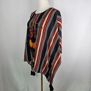 tags: Figue silk tunic, striped tunic, beetle design top, tassel tunic, black multicolor silk, artistic tunic, vibrant print top, silk boho tunic, unique insect tunic, flowy silk top, artsy, art print, art on a shirt, party top, unique, statement piece, night out, special event, silk colorful top,
