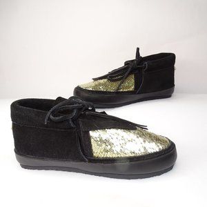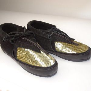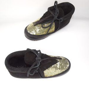 New $450 Figue Lace Up Booties Sequin Moccasins Black Gold Suede Size 5