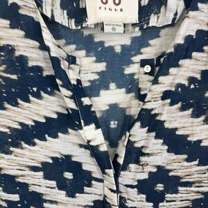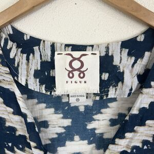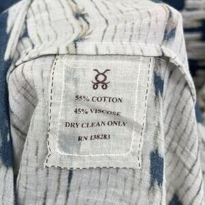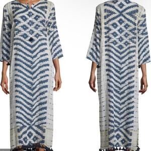 Stunning cream and blue patterned maxi kaftan dress by Figue. Split v-neck and half button down front. Split 3/4 sleeves. Tassel details along bottom hem and a few on the sleeves. Oversized fit. Excellent condition.