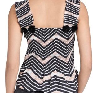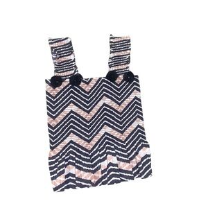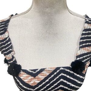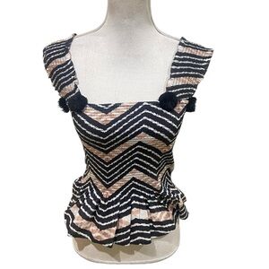Figue Luella Chevron Tie-dye shirred smocked peplum top/vest. In neutral hues of black/tan & cream. Tribal vibe. Square neck. Pom Poms. Lightweight. 100% cotton. Like new. Bought at Neiman Markus.