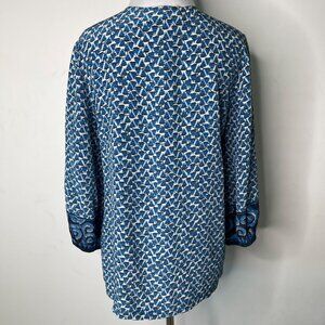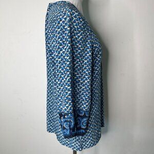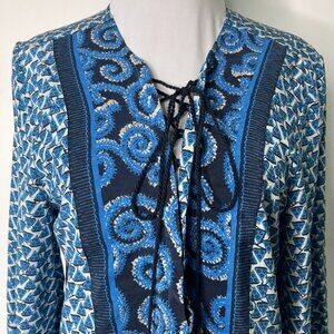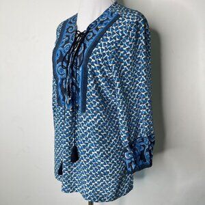 Figue Women's Blue Geometric Print Silk Tassel Long Sleeve Blouse Size Medium