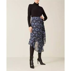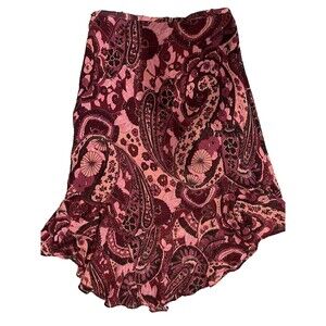 New with Tags $495, Figue women's Papas Maxime 99% Silk Sparkly Flowing Ruffle Asymmetric Hem Midi Skirt, size 8, semi-sheer fabric in shades of maroon burgundy & pink floral paisley print with dashes of metallic silver threading dispersed throughout, knit lining straight across at the knee, hidden zipper closure with hook & eye on right side with long tasseled tie accents.