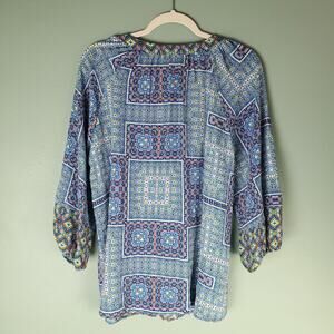 Figueora & Flower Womens Blue Geometric Pattern Bohomian Print Semi-Sheer Peasant Blouse Size XL