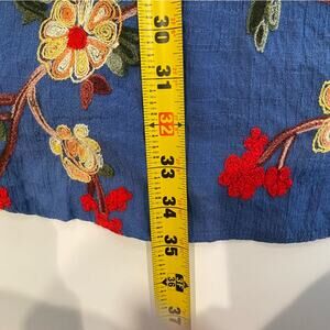 Womens Embroidered Boho Shift Dress in small is in Blue Rayon with Belt. Missing belt loops - but has belt. Gauzy embroidered fabric and is fully lined.