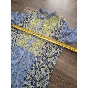 Figueroa & Flower Sheer Floral Button Down Blouse Blue Yellow Boho M Cottagecore