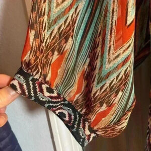 Figueroa & Flower top with Boho look colors are teal brown tan cream & rust. Had lace on shoulders & top back. 3/4 sleeves. Very pretty top. Blouse is 100% polyester lace is 100% nylon women’s size large length 25 1/2” SFPF HOME