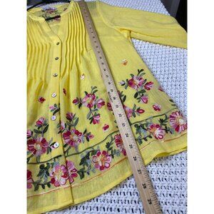 Figueroa & Flowers Women Yellow Flower Long Sleeve Boho Top Size Medium Embroidered Pintuck Cottagecore Mother of pearl button