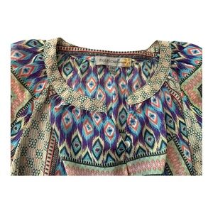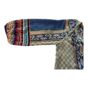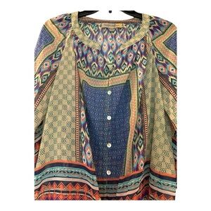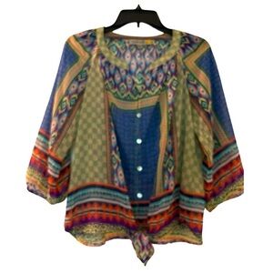 Figueroa +Flowers boho top , multicolored geometrics, full sleeves, buttons