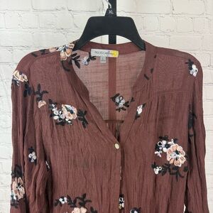 Figueroa and Flower Brown Sheer Button Down Embroidered Flowers Size Large