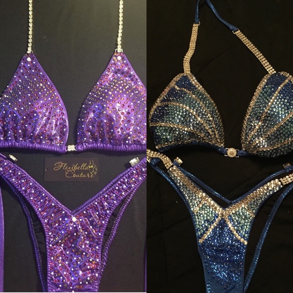SOLD SEPARATELY - Blue: Mix of Silver and three shades of Blue Stones. Bottoms Size Small, Top Cup Size D-DDD Cup worn two competitions, no stains, no stones missing Purple: Volcano and Pearl Stones. Bottoms Size Small, Top Cup Size C-DD worn one competition, no stains, no stones missing. Both handmade, hand sewn by Flexibellacouture at Flexibella.com. If interested, can provide more pictures just ask!