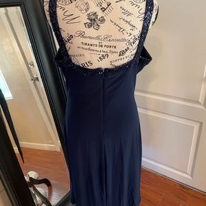 Never worn. Beautiful navy blue color. Figure flattering knit evening dress with beaded embellishment dress with side ruching. American Living Dress.