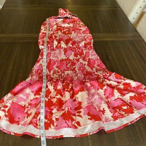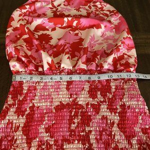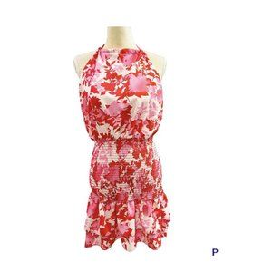 Fiji Fever Pink/Red Floral Smocked Ruffled Hem Halter Mini Dress Size Medium. Barbie Core. Good preowned condition. No stains or holes. Please see pics for details and measurements. Thanks for looking.