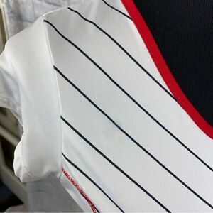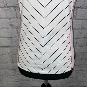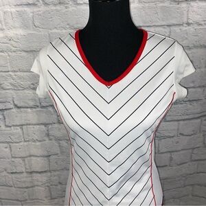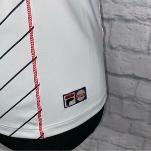 Fila dri fit athletic top white with thin black stripes red trim size small. small spot on upper front shoulder area as shown in picture