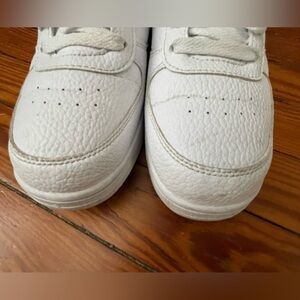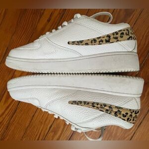White sneakers with a leopard print swoosh