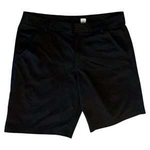 These Fila shorts feature a sleek flat front design in a solid black color, perfect for athletic or casual wear. Made from lightweight, synthetic material, they offer comfort and a smooth, matte finish. The elastic waistband ensures a secure fit, making them ideal for any active occasion. Gently used a few times, in excellent condition.