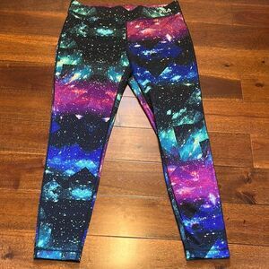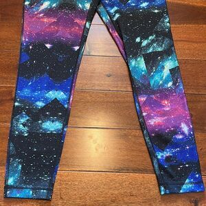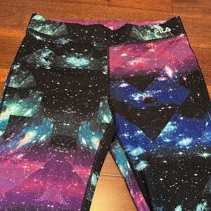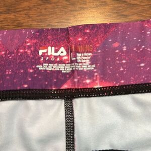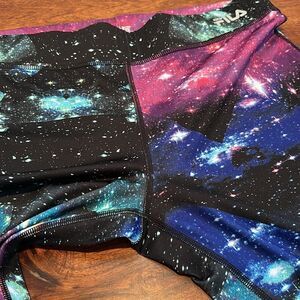Experience the cosmos with Fila's stunning blue and purple galaxy leggings. These form-fitting bottoms feature a mesmerizing cosmic print that swirls with vibrant colors, perfect for making a bold statement. Crafted with a slight sheen, they offer both style and comfort for any active occasion.
