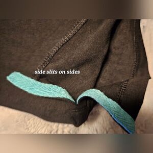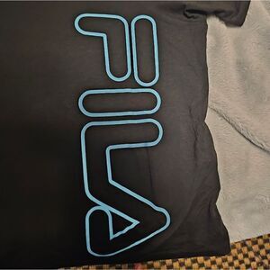 New with tags, Fila crop T-shirt in women's size 2X. Black with horizontal Fila logo on the side. Features side slits with blue material detail.