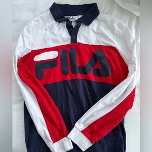 Elegant Fila shirt with dark blue collar. Button accents add style.
