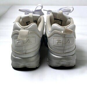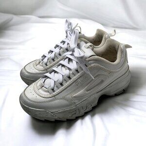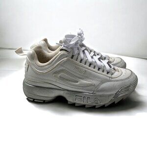 Designed for durability and style, these Fila Disruptor II sneakers feature a chunky sole for enhanced comfort and traction. Ideal for casual wear or light activities, their clean white aesthetic ensures a timeless look that pairs well with various outfits. Size women's 11. Good preowned condition, light marks on the fabric lining and outer leather and sole.
